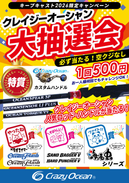 一回500円でクレイジーオーシャンのロッドやカスタムハンドルが当たるチャンスです。
